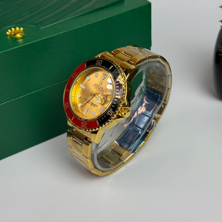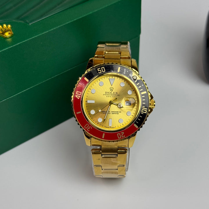 💎 Elevate your collection with the RLX Gold Dial Timepiece, featuring a bold Black & Red (Coke Style) Bezel — where timeless luxury meets modern street style.