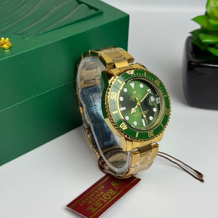 Command attention with the RLX Submariner Gold Edition, featuring a bold emerald green dial and a full gold-tone stainless steel body.