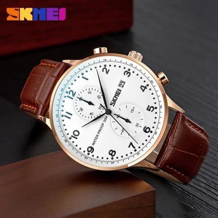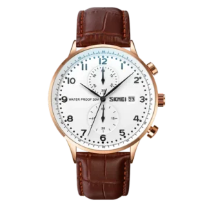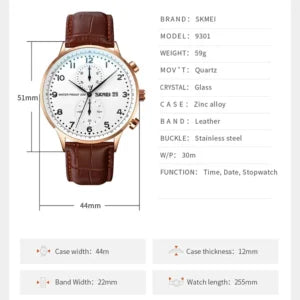 The SKMEI 9301 Quartz Watch is designed for men who want a stylish yet functional timepiece. With its leather strap, classic round dial, and essential features like stopwatch & auto date, it blends modern functionality with timeless elegance.